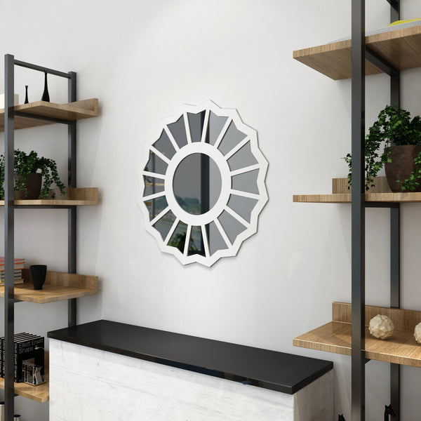 This product is made of 5 mm | 0.20 inches thickness white plastic and silver mirror. The mirror effect may not reflect perfectly. Material characteristics and handling can have a very slightly blurred finish compared to a mirror. It is not a defect, it is a characteristic of the material. We do not recommend it to be used as a mirror. The cuts are made precisely by CNC ensuring accuracy and precision in every panel. Also, they do not have any sanding, pore, or paint treatment.